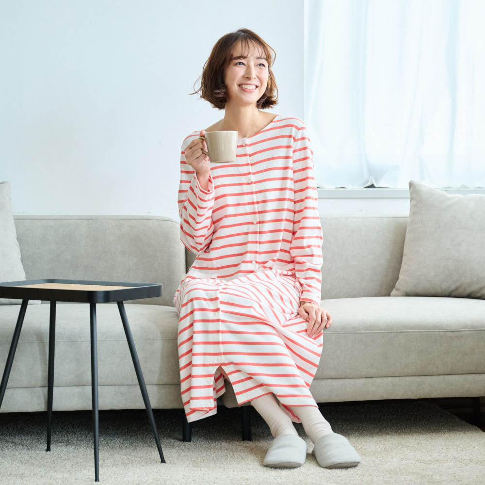 )  【ベルメゾン】入院や自宅療養にも便利なロンパースにもなる多機能ゆったり2WAY長袖前開きワンピースパジャマ